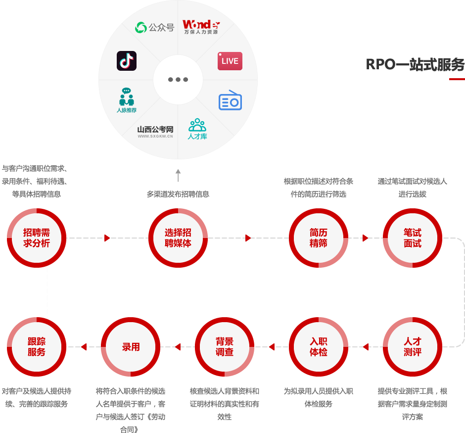招聘流程外包服务(RPO)是一种以客户为导向,以项目为建制,解决招聘任务的服务方案。RPO可以满足企业节约招聘成本、优化招聘流程、缓解招聘压力,保证高质量的招聘结果。